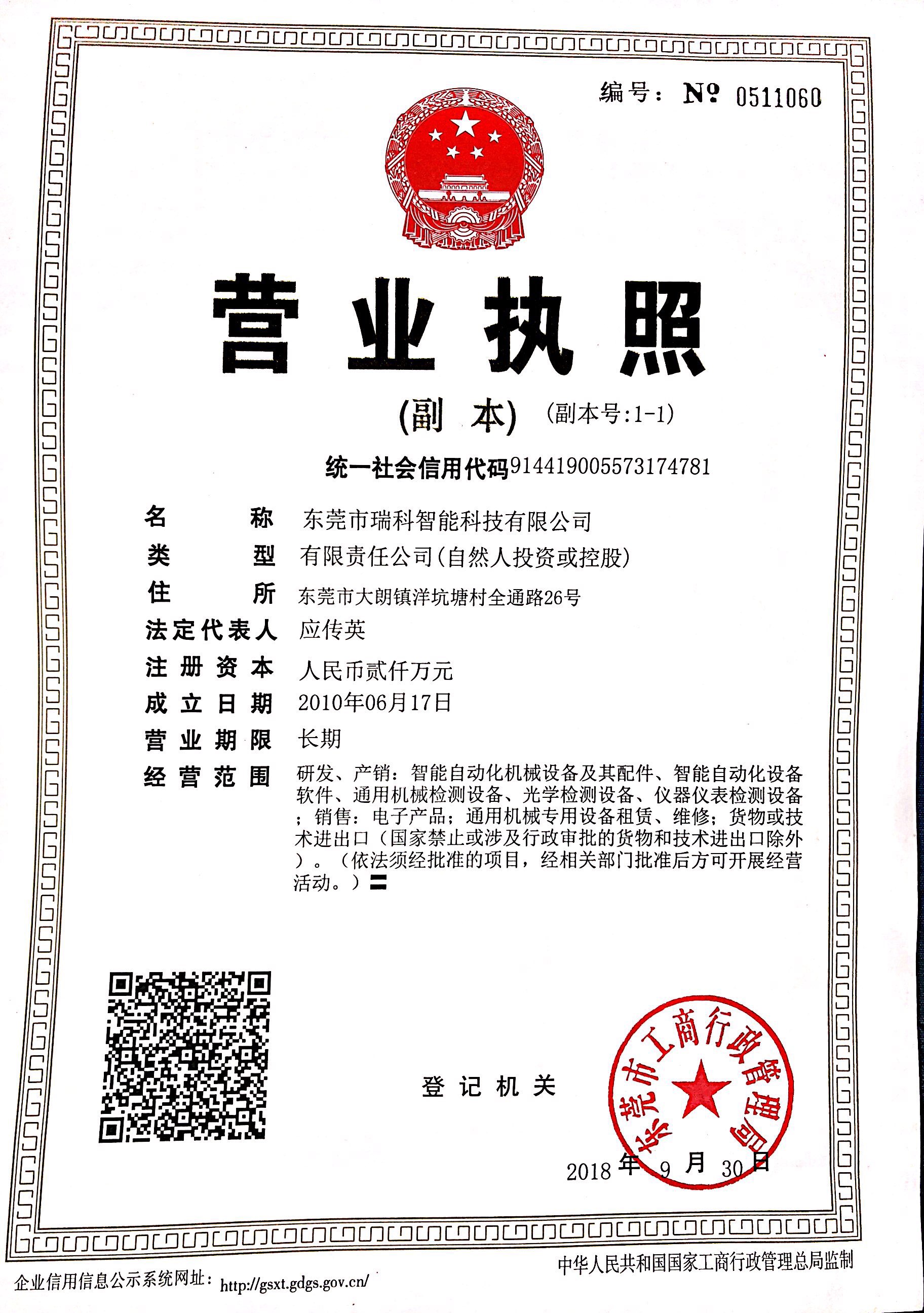 2018年9月30號,東莞市91丝瓜在线观看智能科技有限公司獲得東莞市工商行政管理局注冊成功的新營業執照,東莞市91丝瓜在线观看自動化設備有限公司正式更名為東莞市91丝瓜在线观看智能科技有限公司,標誌著91丝瓜在线观看又發展到一個新的高度。