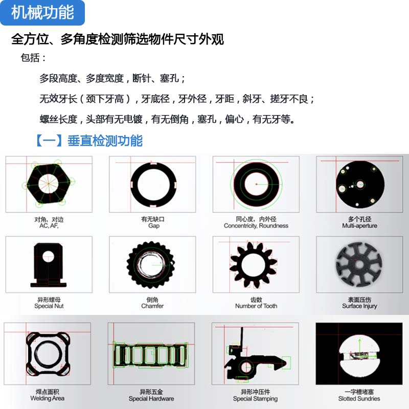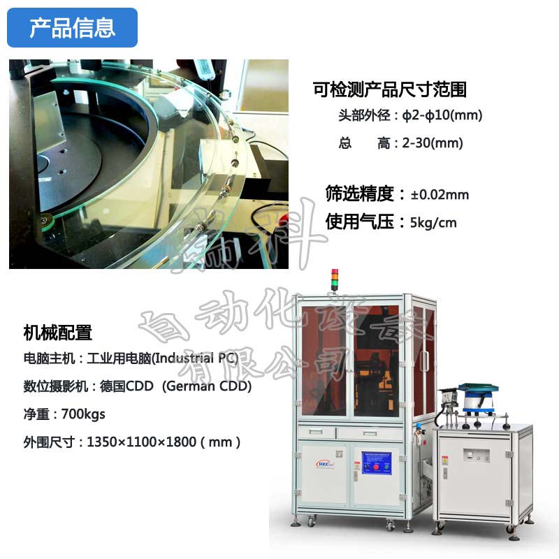 硬體配備包含振動送料機、下料軌道、檢驗平台、計算機係統為一安全、便利,且節省人力成本的自動化設備。分別介紹如下: